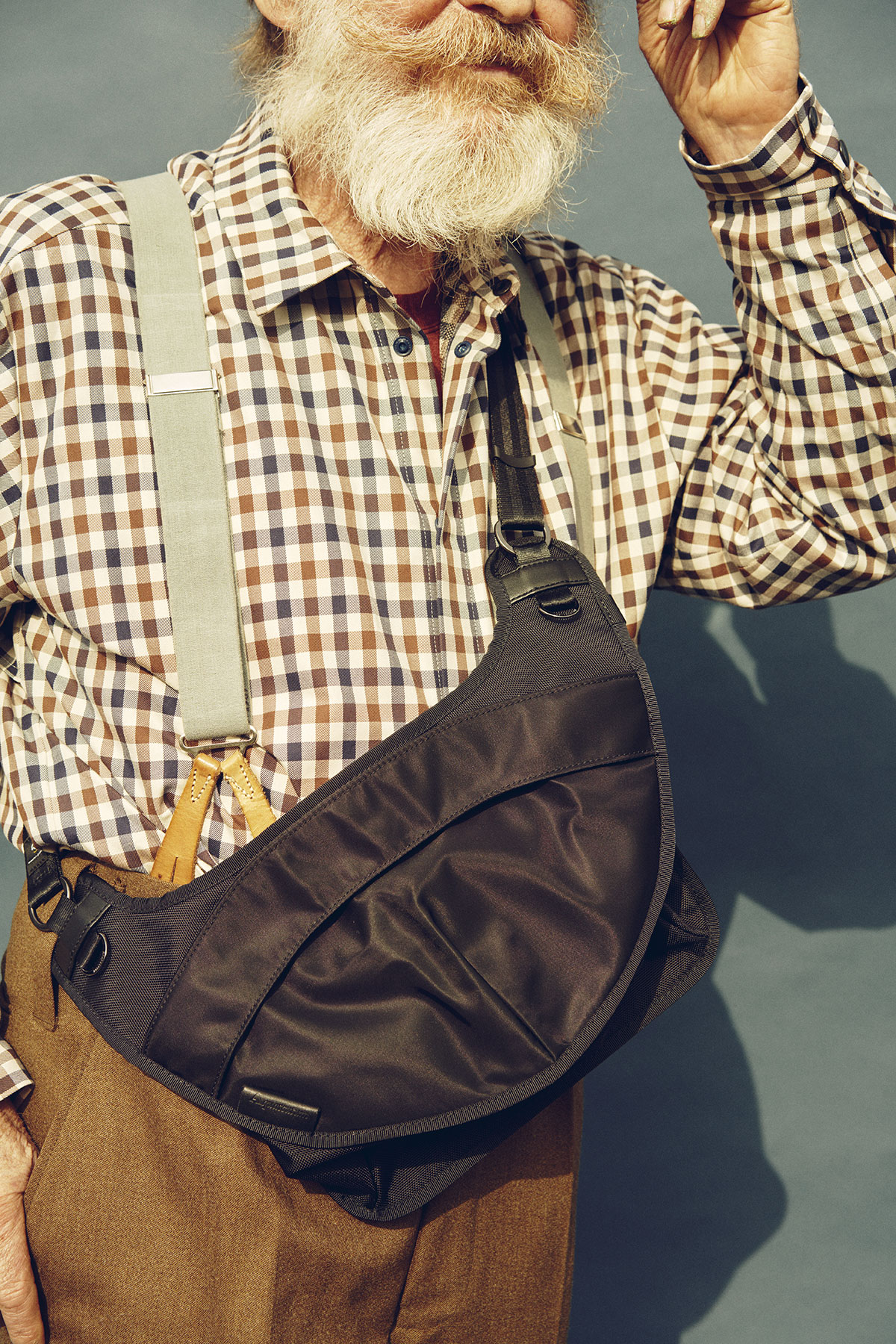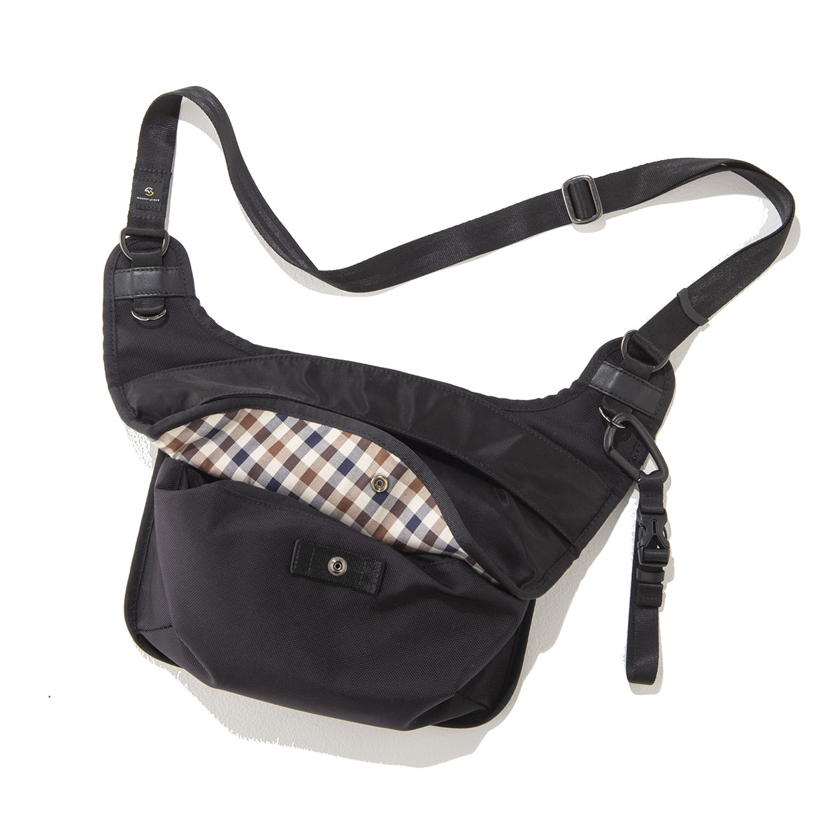 身体の前面での着用を想定したフロントパック。本体素材には、耐久性、防水性に優れたmaster-pieceオリジナルファブリック「MASTERTEX」を使用。裏地にはAquascutumを象徴する伝統的な綿100%のクラブチェック柄を使用。