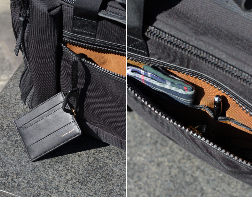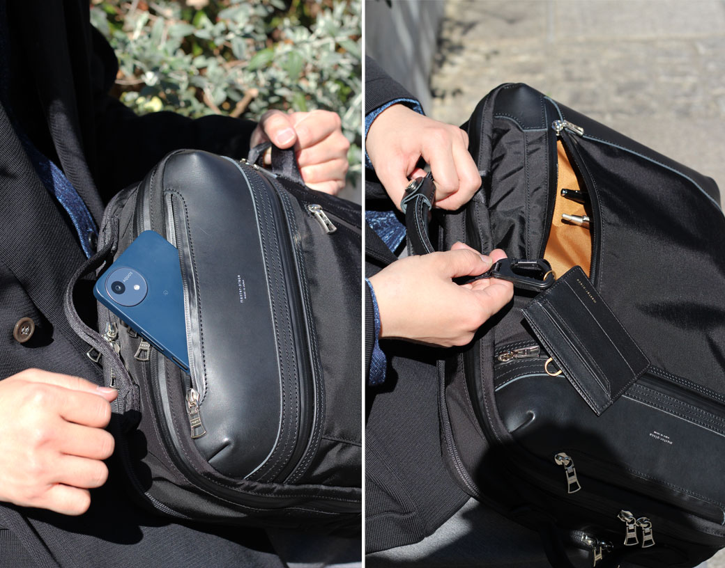 The front pocket is also equipped with divided pockets for pens and small items, as well as a carabiner with a cord — perfect for keeping items you need quick access to, such as a handkerchief, tissues, or an IC card.