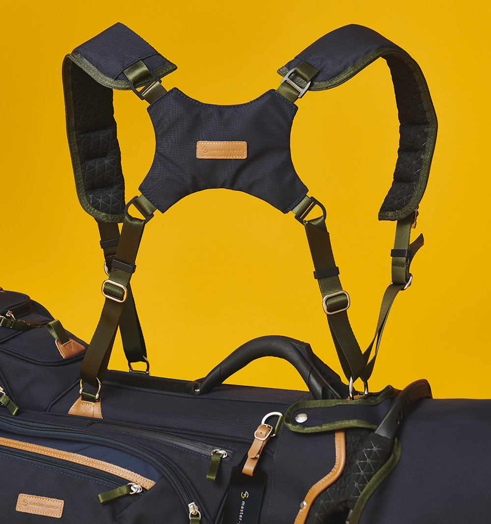 キャディーバッグにはセルフプレーでの持ち運びに適した3点式のショルダーベルトが付属しています。