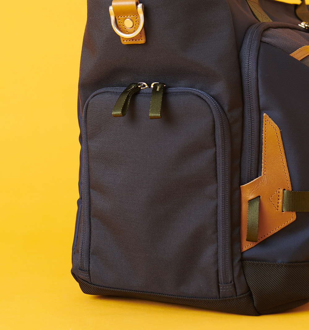 2WAYトートバッグには、本体側面にシューズが収納できるスペースを設けています。広く取られたマチ幅により、シューズ収納時もその他多くの荷物の収納を可能としています。