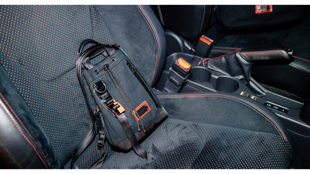 GR YARISやGR COROLLAのシートに採用されるスエード調ファブリックをアップサイクルし、バッグの本体素材に使用。