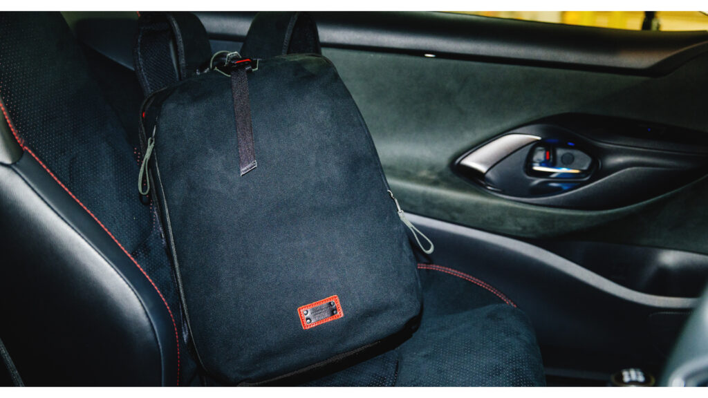 本体素材にはGR YARISやGR COROLLAなどのシートに採用される今回のコラボシリーズ同様のスエード調ファブリックをアップサイクルしています。