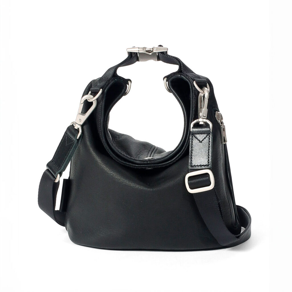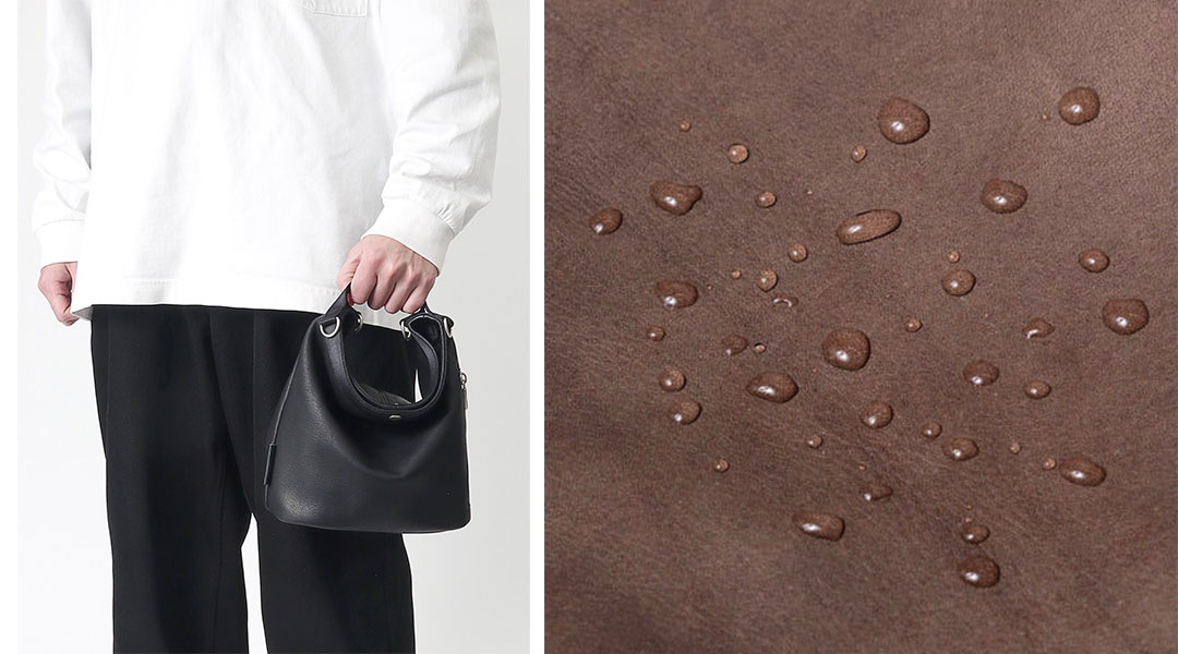 防水性を備えながらソフトに仕上げたレザーに、光沢感のあるナイロンテープを組み合わせたユニセックスデザインのレザーバッグシリーズ。