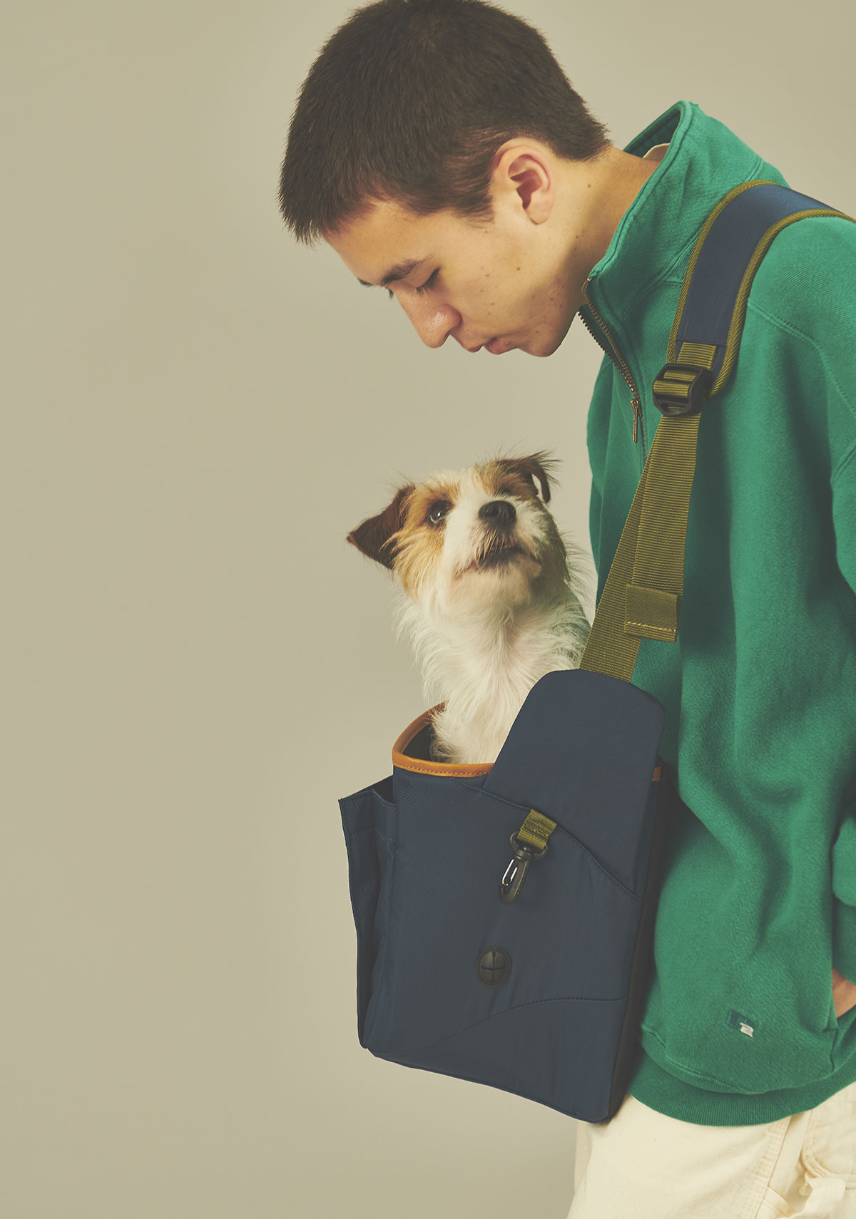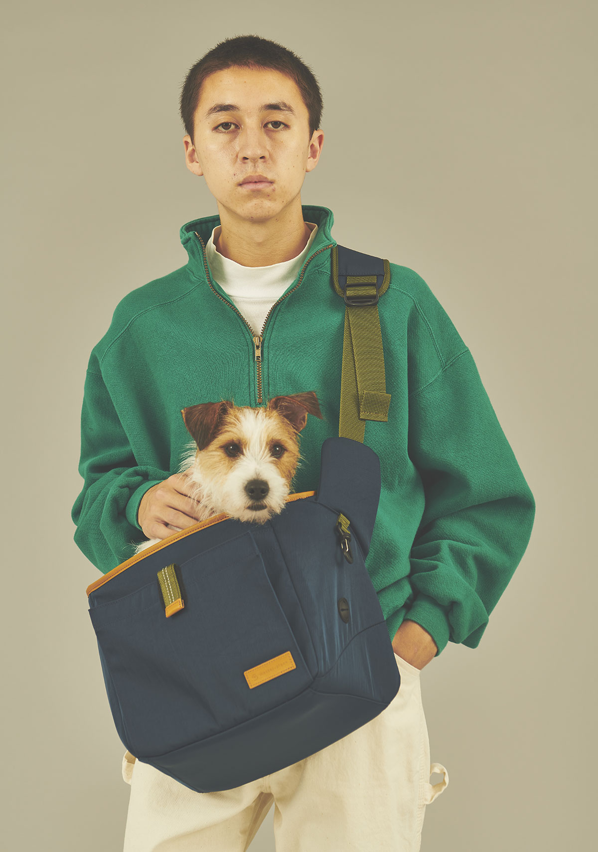 体重7kg以下程度の小型動物を対象としたスリングバッグ。内装着脱シーツには、抗ウイルス機能繊維加工技術 CLEANSE® のポリエステルとコットンの混合ツイル生地を使用しています。