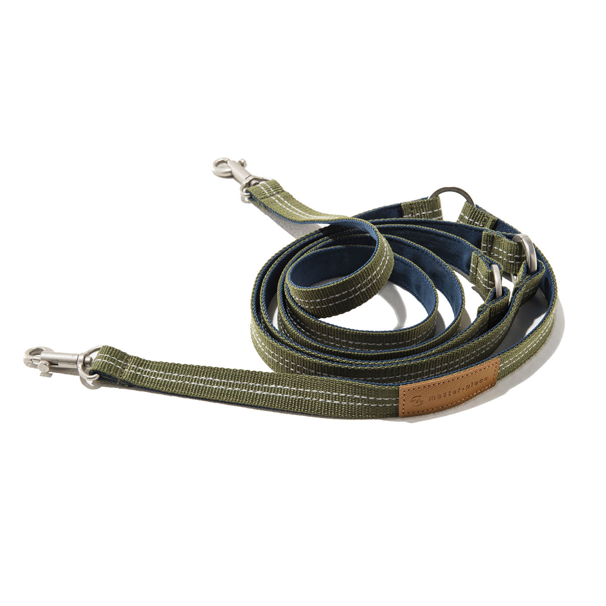 夜間でのお散歩にも配慮した3WAYタイプのリード。お手持ち、斜めがけ、2頭に対応した3WAYタイプ。本体素材は、夜間にカーライトなどの光を反射するようリフレクト糸をライン状に織り込んだポリプロピレンテープを使用しています。