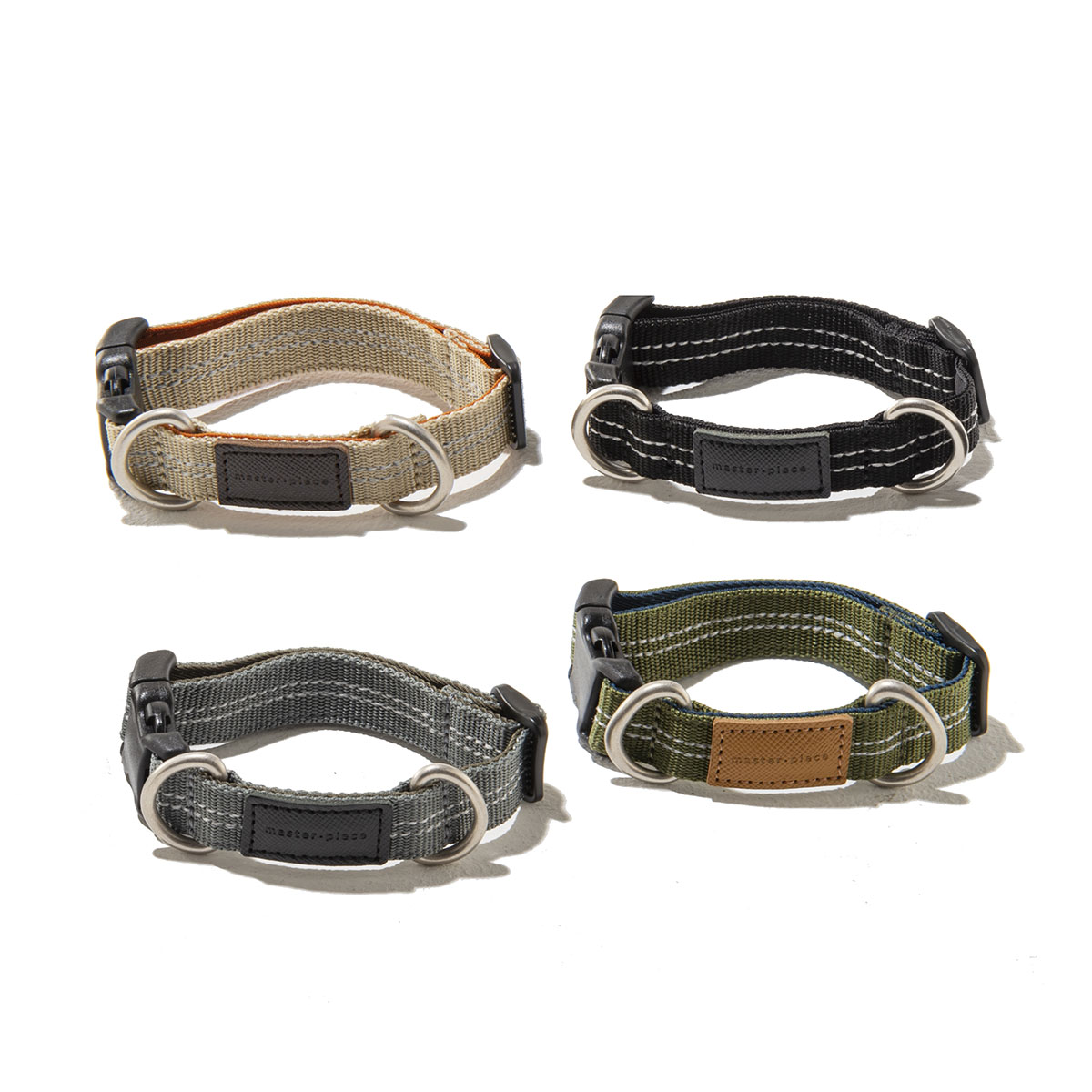 大小2サイズの首輪。本体素材は、夜間にカーライトなどの光を反射するようリフレクト糸をライン状に織り込んだポリプロピレンテープを使用しています。