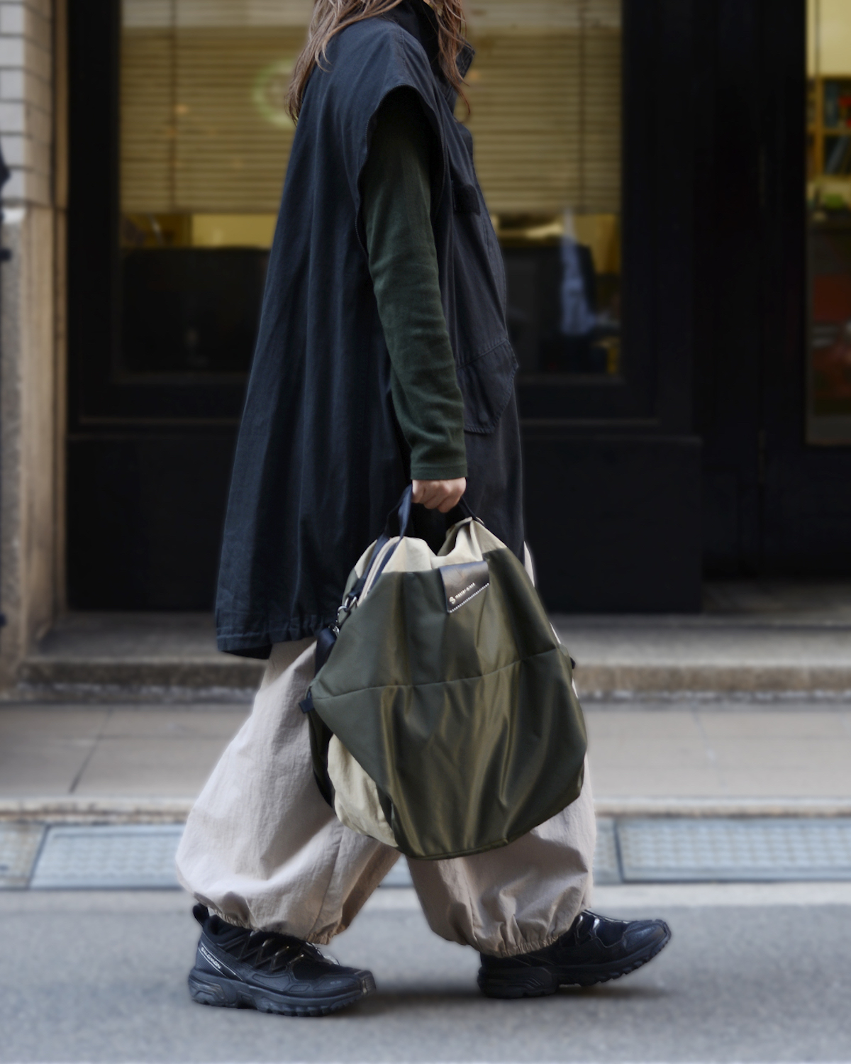 左右のスナップボタンを留めることで、立体的で柔らかなコクーンシルエットが完成します。
