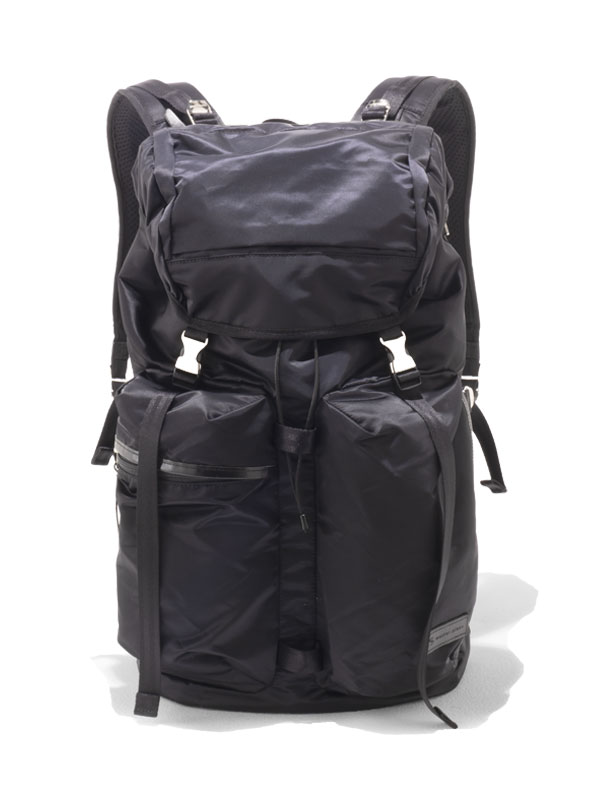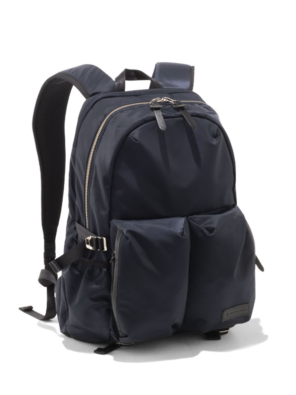 本体素材には、タテ糸に 70d、ヨコ糸に 210d のナイロンセミダル糸をインチ間でタテ 275 本、ヨコ 82 本の高密度で織り上げてハリ、コシを持たせた超高密度 ナイロンツイルを使用しています。タテ糸が表 2 本飛ばし、裏 2 本飛ばしの特殊な織り方をすることで柔らかな光沢感に仕上げております。 付属素材には通常のナイロンよりも耐久性を持ち、摩擦・引き裂きに強い CORDURA Ballistic® fabric1680d ナイロンを使用し、タテ 840d 横ヨコ 40d の撚った糸 を二本ずつ引き揃 えることで、より摩擦・引き裂き強度が強化され、表面には撥水加工、裏面には PU コーティングを施しています。上品なツヤ感を持った超高密度ナイロンツイルと金属パーツを効かせたミリタリーテイストのシリーズです。